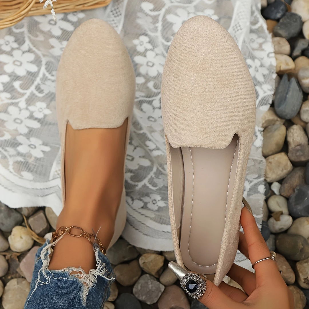 Con puntera redondeada y acabado aterciopelado, estos zapatos estilo bailarina aportan un aire delicado y contemporáneo, perfecto para quienes valoran la elegancia en el día a día.