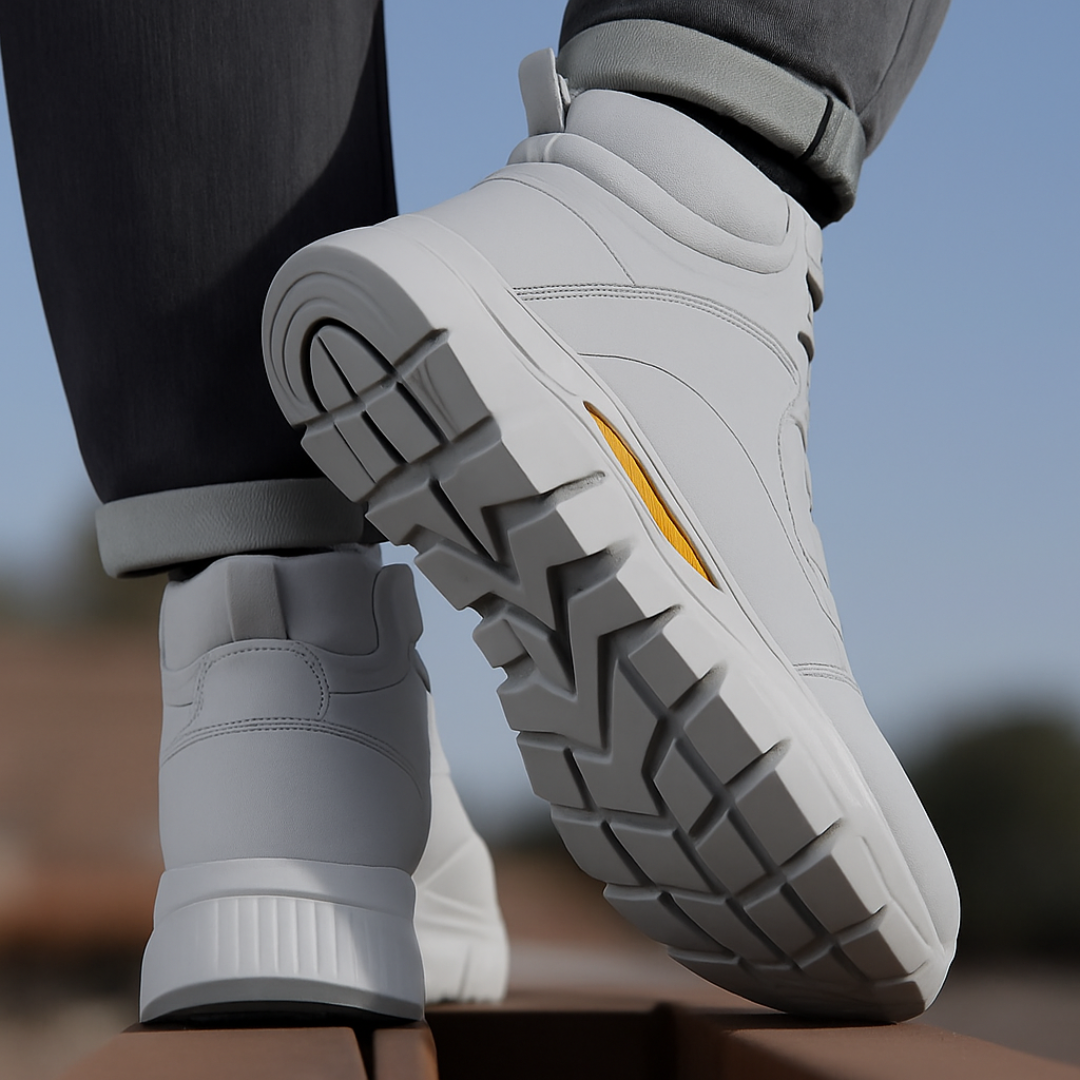 El exterior está confeccionado con microfibra de alta calidad, ofreciendo durabilidad y un acabado estético en color gris. La suela exterior de goma robusta proporciona excelente tracción y estabilidad.